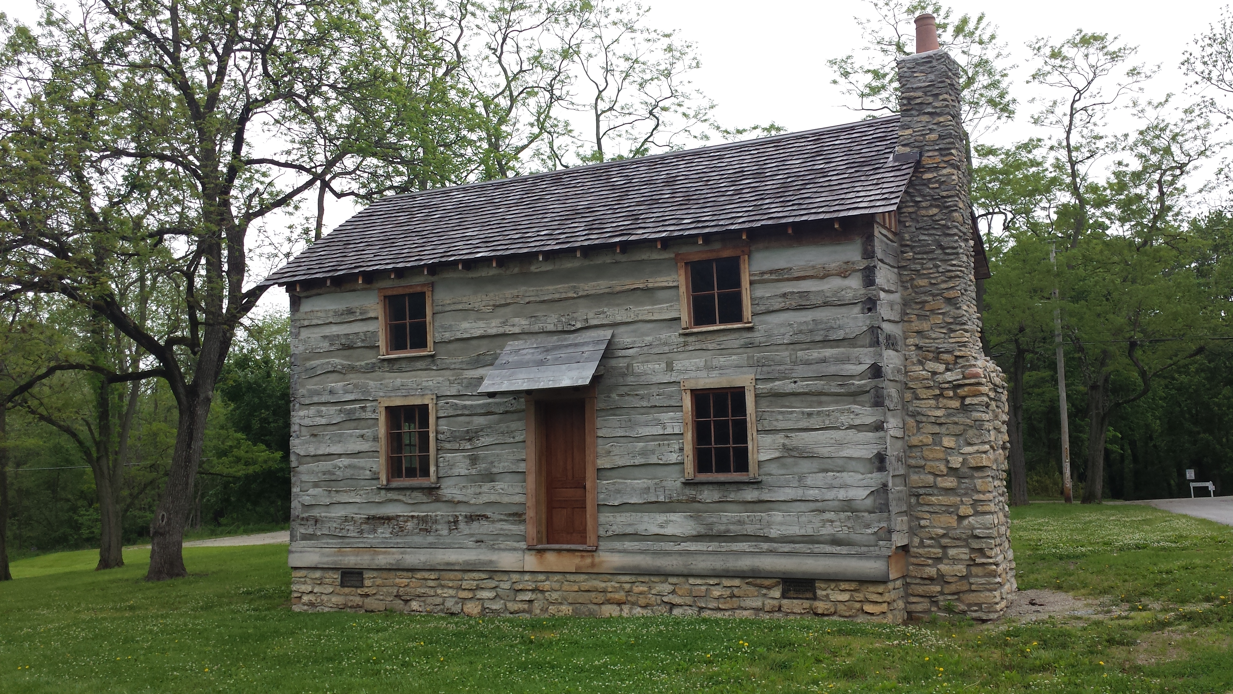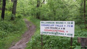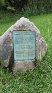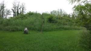 The park brochure states that this large and tall mound is believed to be a memorial to or a lookout for an ancient Adena community. Perhaps greater than 30 feet high and 144 feet in diameter, the mound is located in an open meadow area. It takes about ten minutes to walk to the mound from the parking area with the Log House directly adjacent to Route 42. A plaque by the mounds references the “first Ohioans who sleep within”, so at least someone, at one time, thought it was a burial mound (see picture below).